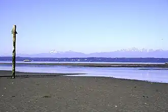 The size of Puget Sound's watershed is 12,138 sq mi (31,440 km2).[4] "Northern Puget Sound" is frequently considered part of the Puget Sound watershed, which enlarges its size to 13,700 sq mi (35,000 km2).[18] The USGS uses the name "Puget Sound" for its hydrologic unit subregion 1711, which includes areas draining to Puget Sound proper as well as the Strait of Juan de Fuca, the Strait of Georgia, and the Fraser River.[19] Significant rivers that drain to "Northern Puget Sound" include the Nooksack, Dungeness, and Elwha Rivers. The Nooksack empties into Bellingham Bay, the Dungeness and Elwha into the Strait of Juan de Fuca. The Chilliwack River flows north to the Fraser River in Canada.