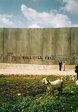 Israel's construction of the barrier began in 2002 and isolates Qalqilya from the north, west, south, and half of its eastern side, leaving a corridor in the east connecting it with smaller Palestinian villages and hamlets.[12] Israel states its construction of the wall is for security purposes, particularly to prevent infiltration by Palestinian militants into Israel as had occurred during the Second Intifada. The Palestinians state that the barrier is meant to annex Palestinian lands (since the wall often juts deep into Palestinian territory) and control the movement of Palestinians. The barrier has negatively affected Qalqilya's economy, particularly the commercial and trade sectors, because it has separated the city from nearby Palestinian localities and bordering Arab towns in Israel, which contributed about 40% of the city's income prior to the barrier's completion. The barrier has also separated 1,836 dunams of mostly agricultural lands and open spaces within Qalqilya's jurisdiction from the city proper. Social relations between Qalqilya's inhabitants and those of other Palestinian cities have also been hindered by the barrier.[12]