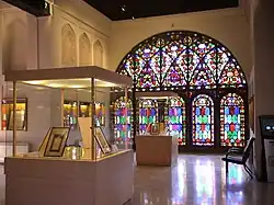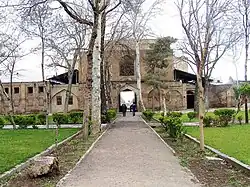 The original Safavid palace complex is located at what is now the city's maidan or central square.[16] Two parts of this now survive: the Chehel Sotun pavilion, which now hosts the Qazvin museum, and the monumental Ali Qapu portal which now serves as the city's police headquarters.[16] The palace complex was probably originally at the northern end of the city - earlier monuments are all to the south and west - but over time the city expanded to the north and the palace precinct ended up in the center of the later Safavid city.[16] This probably happened after the royal court moved to Isfahan under Abbas I in 1596/7 (1005 AH).[16]