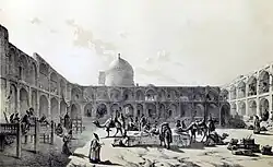 By the beginning of the 19th century, Qazvin was again starting to flourish as a center of trade.[8] Commercial traffic on the Caspian Sea was growing, and Qazvin was one of the main centers of activity – in the words of one traveller in 1801, it was "the mart of all the commerce of the Caspian".[8] Qazvin's importance as a commercial entrepôt was helped by the fact that it lay at a three-way crossroads: it connected Tehran, the new Qajar capital; Tabriz, "the second city of the empire", and the important Caspian port of Anzali.[8] Qazvin was manufacturing velvets, brocades, and cotton cloth.[8] In an 1841 report, the British diplomat Keith Edward Abbott wrote that Qazvin was commercially as important as Tehran.[8] Mirza Husayn Farahani, who visited Qazvin in 1884, wrote that it was divided into 17 districts and had 600 shops, 8 caravanserais, 40 mosques, 9 madrasas, and 12 yakhchals.[8] Its walls were in ruins but 12 gates were still standing.[8]