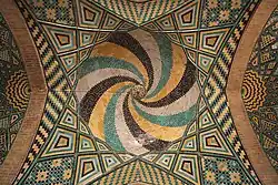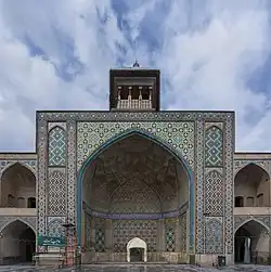 The oldest known structure in Qazvin that still exists is the dome chamber of the city's Jameh mosque, which according to its inscription was built from 1106 to 1114 (500-508 AH).[8] Its patron was the amir Abu Mansur Khumartash ibn Abd Allah al-'Imadi.[8] It was built adjoining an earlier madrasa that was itself built in the 10th century by the sahib Isma'il ibn Abbad.[8] The 13th-century writer Zakariya Qazvini wrote that the dome was "unparalleled anywhere" in size; he wrote that "the masons despaired of vaulting such a huge space until a passing boy suggested that they fill the interior with straw".[8] According to Hamdallah Mustawfi, two iwans were added to the mosque in 1153 (548 AH); the present-day north iwan is Seljuk in style and may be one of them.[8] The present-day mosque mostly dates from the Safavid and Qajar periods; it is one of the largest mosques in Iran.[8]