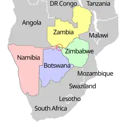 Some older sources claimed that a quadripoint existed in Africa,[10] where the borders of Namibia, Botswana, Zambia, and Zimbabwe come together at the confluence of the Cuando (also called Chobe) and Zambezi rivers.[11][12][13] In the absence of legal clarity, it is now widely believed that instead, two separate tripoints exist about 100 to 150 metres (330–490 ft) apart (but see below regarding due diligence preceding bridge construction).