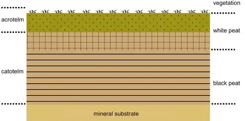 Growing bogs can be divided into two layers. The 'acrotelm' (Greek: akros = highest; telma = bog) is the upper part and includes the vegetation layer and the bog 'floor'. Here fresh organic substances (peat formation horizon) are created by the growth and dying of plant elements. The "catotelm" (Greek: kato = below) is the underlying water-saturated part with less biological activity. This layer is counted as a geological subsoil due to the small earth-forming processes that are still going on and is known as the peat preservation horizon (Torferhaltungshorizont). In raised bogs, the upper peat layer is called white peat, since it consists of largely undecomposed light brown peat mosses. The lower layer is black peat, which is already well humified and has a black-brown colour with still recognizable plant remains.