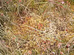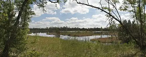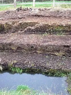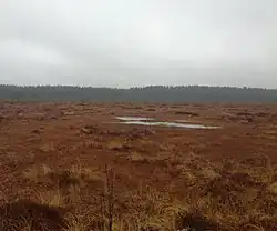 The largest central European raised bog areas are the southern North Sea coastal area and the Alpine Foreland. As in North America there is a succession of raised bog types along the line of descent towards the ocean, from northwest to southeast. As a result of peat use, raised bogs have been harvested for peat and cultivated, apart from a few remnants (less than 10% of the original area). The largest contiguous raised bog in central Europe was the Bourtange Moor, which originally covered an area of about 2,300 km2 including the Dutch portion, but only small sections remain. The largest remaining raised bog in northern Europe is the 76 km2 Lille Vildmose.[3] Other large raised bogs are the Teufelsmoor northeast of Bremen, the Vehnemoor (exhausted) and the Esterweger Dose (formerly about 80 km2, exhausted) between Oldenburg and Papenburg. The raised bogs of the Central Uplands of the Harz, Solling, Thuringian Forest (Großer Beerberg, Schneekopf - Teufelsbad, Fichtenkopf, Saukopf), Giant Mountains, Ore Mountains, Fichtel and Rhön (Black Moor, Red Moor) are, by contrast, comparatively small. In the Black Forest the Wildseemoor has been protected and, in the Vosges on le Tanet, north of the Col de la Schlucht a large area has been protected. The Alpine Foreland, which was formed by ice-age glaciation, is also rich in peatland. The Wurzacher Ried (Haidgauer Regenmoorschild) is considered the largest and best preserved raised bog in central Europe. Other raised bogs and peatland areas include the Federsee, the High Fens on the Germano-Belgian border, the Ewiges Meer near Aurich and the Lengener Meer near Wiesmoor. In 2003, Estonia exported 3.6 million m³ of peat for west European garden use, more than 60% of the state production. In Lithuania 60% of the usable peat area has been prepared for extraction or is already exhausted.[4]