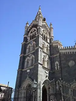- Santa Maria Assunta church has a façade completely built of black lava stone, three polygonal apses in the form of towers and 15th-century side portals in the Catalan-Gothic style. The huge interior is divided into three naves by black monolithic columns, and preserves statues by the Gagini school and six paintings by Giuseppe Velasquez (1750–1827).
