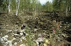 Dragon Cone, just east of Ray Lake, erupted about 7,500 years ago and the lava, called the Dragon's Tongue, flowed 15 km (9.3 mi) down Falls Creek Valley. Ray Lake was dammed and enlarged by this lava. The toe of this lava flow dammed the Clearwater River and raised the level of Clearwater Lake by about 5 m (16 ft). A hiking trail from Clearwater Lake Campground gives access to the Dragon's Tongue where it consists of piles of jagged aa lava.[3]