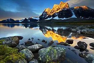 ![]() Redoubt Peak seen from Amethyst Lakes at sunrise | |
