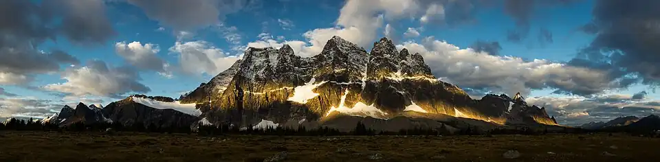 Redoubt Peak is a 3,109-metre (10,200 ft) mountain summit located on the shared border of Jasper National Park in Alberta, and Mount Robson Provincial Park in British Columbia, Canada. Redoubt Peak is part of The Ramparts in the Canadian Rockies. It was named in 1920 because it has an appearance similar to that of a redoubt on a castle.[1] Its nearest higher peak is Dungeon Peak, 0.6 km (0.37 mi) to the southeast.[1]