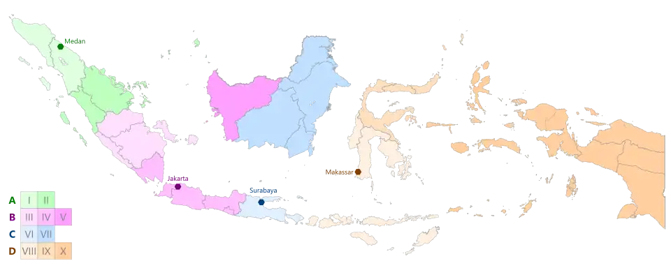 | Development Region X | Maluku, North Maluku, Central Papua, Highland Papua, Papua, South Papua, Southwest Papua, and West Papua |