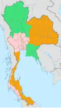 The Thai Meteorological Department divides the country into six regions for meteorological purposes.[2] It differs from the four-region system in that the east is regarded as a separate region, the south is divided into east and west coasts, and Nakhon Sawan and Uthai Thani are grouped in the central region.