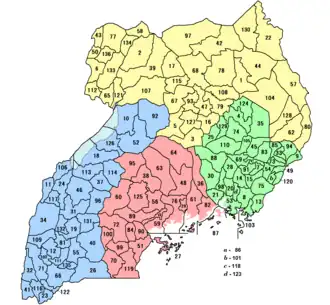 The regions of Uganda are known as Central, Western, Eastern, and Northern. These four regions are in turn divided into districts. There were 56 districts in 2002,[1] which expanded into 111 districts plus one city (Kampala) by 2010.[2]