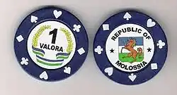 The Valora (issued by the Bank of Molossia) is divided into 100 Futtrus and denominations of 1, 5, 10, 20 and coins in 1, 5, 10, 30 (plastic); it has an exchange rate of 0.80 USD to one Valora.[14] The Valora is also valued to Pillsbury Chocolate Chip Cookie Dough[16] with one tube of cookie dough (13 Ba / 30 oz) being equal to 5 Valora.[14]