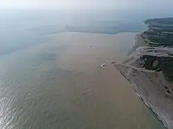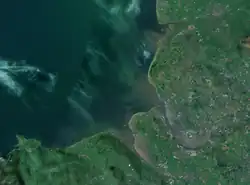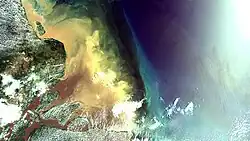 A river plume is a freshened water mass that is formed in the sea as a result of mixing of river discharge and saline seawater.[1] River plumes are formed in coastal sea areas at many regions in the World. River plumes generally occupy wide-but-shallow sea surface layers bounded by sharp density gradients. The area of a river plume is 3-5 orders of magnitude greater than its depth; therefore, even small rivers with discharge rates ~1–10 m/s form river plumes with horizontal spatial extents ~10–100 m. Areas of river plumes formed by the largest rivers are ~100–1000 km2. Despite the relatively small volume of total freshwater runoff to the World Ocean, river plumes occupy up to 21% of shelf areas of the ocean, i.e., several million square kilometers.[2]