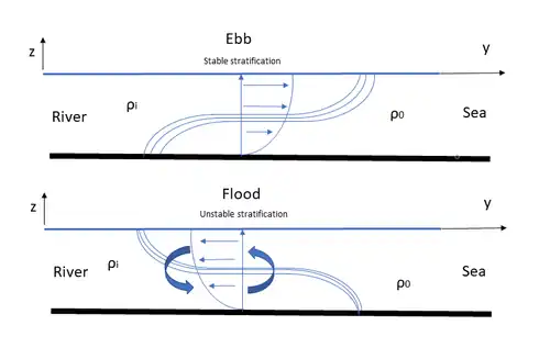 A tidal cycle consists of a flood period or landward flow, and an ebb period or seaward flow.[15] For constant river discharge one can find a stable stratification during ebb conditions and an unstable stratification during flood conditions.[11] This is schematically portrayed in the figure to the right. The mixing that occurs during flood conditions due to the unstable stratification weakens the stratification and efficient river plume advection[11] and occurs in situations with low estuarine Richardson numbers.