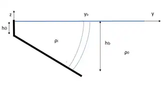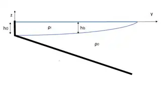 Bottom-advected plumes are often characterized by large discharge conditions and are generally less sensitive to wind forcing and corresponding advection and mixing.[6] This type of advection is driven by bottom Ekman transport, which drives the fresh or brackish river outflow with density and velocity from an estuary of width and depth to the frontal zone across the shelf. This is indicated in the figure to the right. When the frontal zone is far enough from the shore, thermal wind dynamics can transport the complete volume flux away from the estuary. The across-shore position , which denotes the width of the coastal current, and the equilibrium-depth at which the plume separates from the bottom can be calculated in equilibrium conditions with a certain bottom slope by