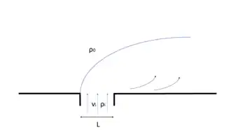 In the case that the inflow depth is smaller than depth , and the distance up to which the bottom Ekman layer transports the river discharge is smaller than the distance up to which the surface processes transport the river outflow, (), one can find an intermediate plume. In an intermediate plume both regimes can be found. Naturally, the bottom-advected section can be found closer to the estuary mouth and the surface-advected section can be found further offshore. The liftoff point separates the regions.[6][7]