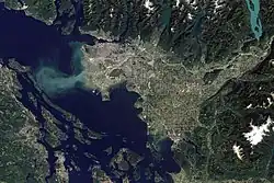 An example of a surface-advected plume is the Fraser River plume. The Fraser River plume contains all dynamical regions, clearly visible from space. The initial jet-like structure gradually transfers into a far-field plume further offshore, which is deflected to the right as would be expected on the Northern Hemisphere due to the Coriolis effect. Other similar river plumes are those of the Columbia River, the Niagara River, and the Hudson River.[1][9]