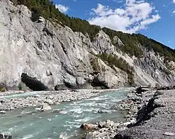 The rockslide debris blocked the river, creating Lake Ilanz, which lasted for several centuries before gradually draining as the Anterior Rhine cut through the material.[3] The present-day gorge features a meandering river with alternating gravel and sandbanks, rapids, and river terraces, bordered by cliffs rising to heights of up to 350 metres (1,150 ft).[3][2]