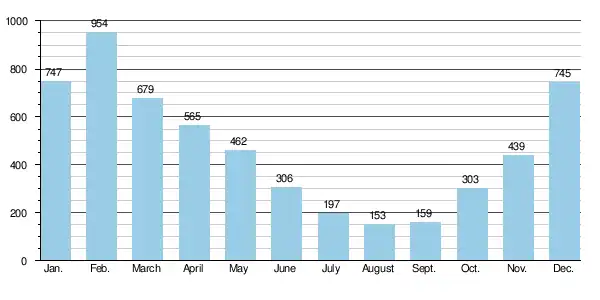 Overall, the average flow rate in Lyon is 475 cubic metres per second (16,800 cu ft/s), with a minimum of 153 cubic metres per second (5,400 cu ft/s), in August, and a maximum of 954 cubic metres per second (33,700 cu ft/s), in February.[8]