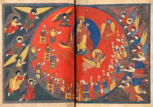 The manuscript contains the Commentary on the Apocalypse of Beatus of Liébana, a commentary on Daniel by Saint Jerome and a treatise on the Virgin Mary by Saint Ildefonsus.[4][5] Parts of it are displayed in the Musée des Jacobins in Saint-Sever.