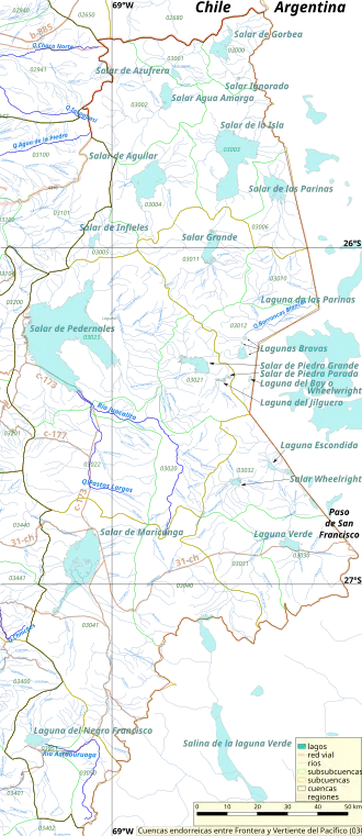 {{cite journal}}: CS1 maint: article number as page number (link) - Risacher, François; Alonso, Hugo; Salazar Méndez, Carlos (January 1999). Geoquímica de aguas en cuencas cerradas: I, II, III regiones - Chile (PDF) (Report) (in Spanish). Dirección General de Aguas.