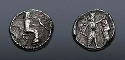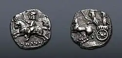 Persian Achaemenid coin minted in Samaria, dated c. 375–333 BC. Left; Persian satrap holding lance and reins on horseback, Aramaic inscription BDYḤBL below. Right; satrap and driver in chariot drawn by two horses