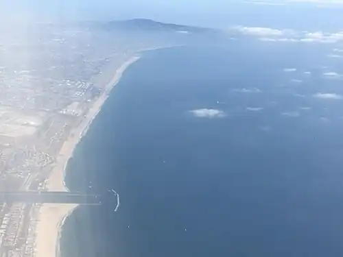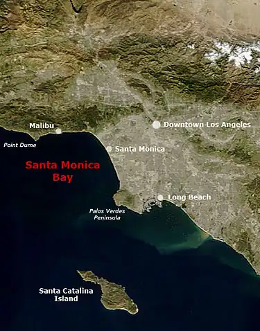 Santa Monica Bay is a bight of the Pacific Ocean in Southern California, United States. Its boundaries are slightly ambiguous, but it is generally considered to be the part of the Pacific within an imaginary line drawn between Point Dume, in Malibu, and the Palos Verdes Peninsula. Its eastern shore forms the western boundary of the Los Angeles Westside and South Bay regions. Although it was fed by the Los Angeles River until the river's catastrophic change of course in 1825, the only stream of any size now flowing into it is Ballona Creek. Smaller waterways draining into the bay include Malibu Creek, Topanga Creek, and Santa Monica Creek.