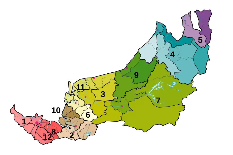 Unlike states in Peninsular Malaysia, Sarawak is divided into 12 divisions, each headed by an appointed resident.[105][129][130]