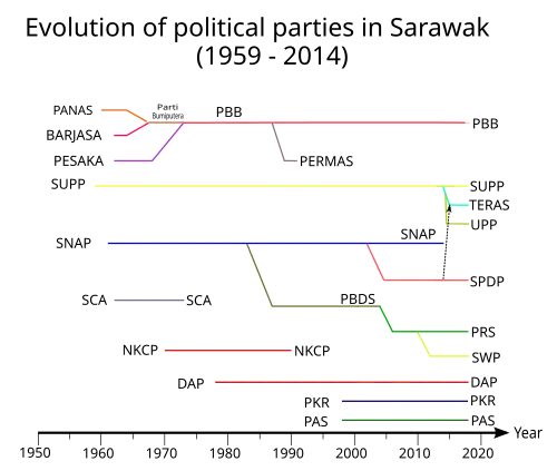 Since the 2006 state election, the Democratic Action Party (DAP) has derived the majority of its support from urban centres and became the largest opposition party in Sarawak.[120] In 2010, it formed the Pakatan Rakyat coalition with Parti Keadilan Rakyat (PKR) and Parti Islam Se-Malaysia (PAS); the latter two parties had become active in Sarawak between 1996 and 2001.[121] Sarawak is the only state in Malaysia where West Malaysia-based component parties in the BN coalition, especially the United Malays National Organisation (UMNO), have not been active in state politics.[122]