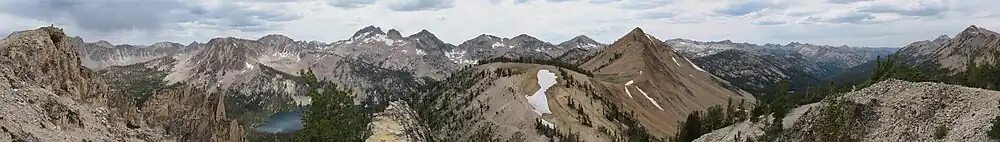 The northern Sawtooth Range formed from the Eocene Sawtooth batholith, while south of Alturas Lake the mountains formed from the Cretaceous granodiorite of the Idaho Batholith.[7][8] The Sawtooth Range has a history of alpine glaciation, but while no surface glaciers exist today, perennial snow fields and rock glaciers remain, usually on north or east facing slopes. There have been 202 perennial snow fields mapped in the Sawtooth Range.[9] The Sawtooth Range was last extensively glaciated in the Pleistocene, but glaciers probably existed during the Little Ice Age, which ended around 1850 AD.[10][11] Evidence of past glaciation given remnants of the glaciers such as glacial lakes, moraines, horns, hanging valleys, cirques, and arêtes.[10]