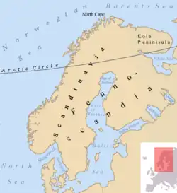 - ^ (Swedish: Skandinaviska halvön; Norwegian: Den skandinaviske halvøy (Bokmål) or Den skandinaviske halvøya (Nynorsk); Finnish: Skandinavian niemimaa)