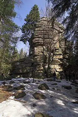 Schnarcherklippen is the name of a rock formation (up to 671 m above sea level) south of the village of Schierke in the High Harz mountains of Saxony-Anhalt in central Germany. The name translates roughly to "snoring crags" or "snoring rocks".