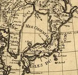 According to South Korea's Ministry of Foreign Affairs, the name East Sea (Donghae(동해)) can be found in various historical records produced in the span of over 2,000 years, including the History of the Three Kingdoms (1145),[7] the monument of King Gwanggaeto (414), and "Map of Eight Provinces of Korea" (八道總圖, 1530).[8] According to such records, the name East Sea is almost 1,700 years older than the first documented world map to name the area the Sea of Japan, the Kunyu Wanguo Quantu (坤輿萬國全圖), which was drawn by the Italian missionary Matteo Ricci in China (1602). No Japanese record published up to the late-18th century indicated any name for the body of water.[9] Furthermore, South Korea has pointed out that Japan itself recognized the sea as Sea of Joseon (Korea) not Sea of Japan since some 18th and 19th-century Japanese maps referred to the sea as Chōsenkai (朝鮮海, literally Sea of Joseon), including the Simplified Map of Japan's Periphery (日本邊界略圖; 1809), Map of Asia (亞細亞全圖, 1794) which was drawn by Katsuragawa Hoshu (桂川甫周) and the New World Map (新製輿地全圖; 1844).[8] Additionally, it specifically states that the name Sea of Japan was not widely used, even in Japan, as late as the mid 19th century.[10] Moreover, South Korea argues that it was unable to present its case for the name 'East Sea' internationally because it was under Japan's colonial rule and in the midst of the Korean War.[11] In 1992, the name "East Sea" was agreed upon as English name for the sea in South Korea and claimed by the country for the sea during its participation in the U.N. Conference on Standardization of Geographical Names.[12]