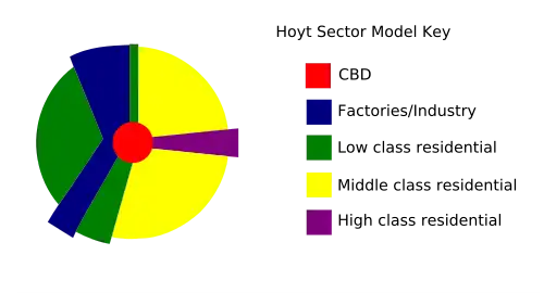 The sector model, also known as the Hoyt model, is a model of urban land use proposed in 1939 by land economist Homer Hoyt.[1] It is a modification of the concentric zone model of city development. The benefits of the application of this model include the fact it allows for an outward progression of growth. As with all simple models of such complex phenomena, its validity is limited.[2]