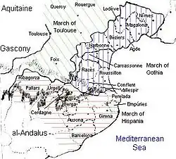 The region of Septimania was invaded by the Andalusian Muslims in 719, renamed as Arbūnah and turned into a military base for future operations by the Andalusian military commanders.[5][6] It passed briefly to the Emirate of Córdoba, which had been expanding from the south during the same century, before its subsequent conquest by the Christian Franks in 759,[5][6] who by the end of the 9th century renamed it as Gothia or the Gothic March (Marca Gothica). After the Frankish conquest of Narbonne in 759, the Muslim Arabs and Berbers were defeated by the Christian Franks and retreated to their Andalusian heartland after forty years of occupation, and the Carolingian king Pepin the Short came up reinforced.[5][6] Septimania became a march of the Carolingian Empire and then West Francia down to the 13th century, though it was culturally and politically autonomous from the northern France-based central royal government. The region was under the influence of the people from the count territories of Toulouse, Provence, and ancient County of Barcelona. It was part of the wider cultural and linguistic region comprising the southern third of France known as Occitania. This area was finally brought under effective control of the French kings in the early 13th century as a result of the Albigensian Crusade, after which it was assigned governors. From the end of the thirteenth century Septimania evolved into the royal province of Languedoc.