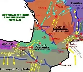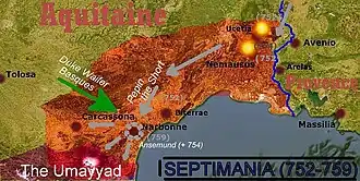 The region of Septimania, in southern Gaul, was the last unconquered province of the Visigothic Kingdom.[25] The incursion into Septimania was motivated by the need to secure their territorial gains in Iberia.[25] Arab and Berber Muslim forces began to campaign in Septimania in 719.[25]