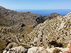 The highway Ma-2141 leads over the saddle down to the beach town of Sa Calobra, one of the supposed most picturesque roads of Spain.[4] The road is also a famous target for road cyclists.[5]