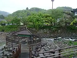 Tokko-no-yu is the best known hot spring in the system; it is located between the banks of the Katsura River in the middle of Shuzen town. A small rustic open-air public bath house has been built above the spring containing an ashiyu or foot spa.[2][5] Kawara-no-yu is a hot spring in the system that is used as a public foot bath; it is located at the riverside.[6] There are numerous commercial spa hotels and historic ryokan in the area, as well as Hakoyu, the public bathhouse.[7]