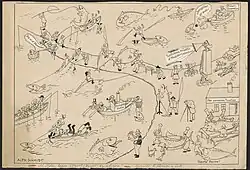 Satirical drawing by Alfred Schmidt of the tuna fishing off Sjællands Odde, 1929