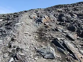 ![]() Slates of the Kirk Stile Formation, exposed just below Skiddaw summit ridge | |