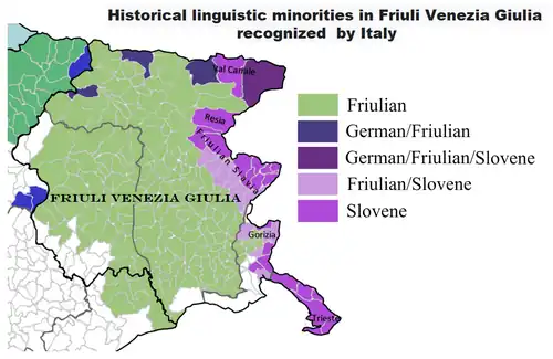 Slavia Friulana, which means Friulian Slavia, also known as Venetian Slavia (Slovene: Beneška Slovenija), is a small mountainous region in northeastern Italy and western Slovenia. It is so called because of its Slavic population which settled here in the 6th century AD. The Italian territory is located in the Italian region of Friuli-Venezia Giulia, between the town of Cividale del Friuli and the Slovenian border. The Slovenian territory encompasses ten villages in the area of the Breginj Combe.[1]