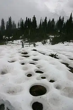 The snow melts earlier in forest also for example on microtopographic mounds (small elevations) or in wet places like edges of creeks or in seeps. These microsites affect distribution of many herbs too.[4]