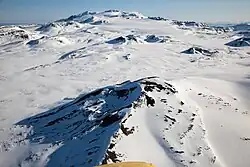 Individual eruptive centres of the Snowshoe Lava Field have been given numeronyms ranging from SLF-1 to SLF-12; greater numbers indicate a younger age.[12] SLF-1, SLF-2 and SLF-3 are alkali basaltic and formed subglacially when outlet glaciers of Mount Edziza's ice cap extended to lower elevations during the climax of a glacial advance.[2][22] SLF-4, SLF-5, SLF-6, SLF-7 and SLF-8 are volcanic cones formed when eruptions were at first subaqueous and then transitioned subaerially.[2][23] They consist of alkali basalt and minor hawaiite which are in the form of subaqueous and subaerial ejecta.[24] SLF-9, SLF-10, SLF-11 and SLF-12 are completely subaerial in origin and consist mainly of hawaiite.[2][25] They are in the form of pyroclastic cones with the exception of the youngest eruptive centre, SLF-12.[26]