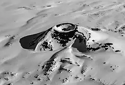 The youngest subaerial eruptive centre, SLF-12, is The Saucer which appears to be the remains of a fissure instead of a pyroclastic cone.[39] This vent south of Tencho Glacier issued lava that travelled eastward and westward; the 5 km (3.1 mi) long eastward lava flow entered the head of Shaman Creek whereas the relatively thick westward lava flow spread onto the Big Raven Plateau in the form of broad lobes.[2][39] In contrast to the neighbouring Coffee Crater lava flows which are overlain by thick drifts and pockets of Sheep Track pumice, The Saucer and its lava flows are only sparsely covered with very fine pumice of the Sheep Track Member.[40] The sparsity of this very fine pumice on The Saucer and its lava flows suggests they were extruded sometime after the explosive Sheep Track eruption which may have occurred around 950 CE.[21][40] Because very fine pumice is susceptible of being blown by wind, it could easily be wind-blown material carried in from neighbouring pumice beds long after the Sheep Track eruption had occurred.[41]