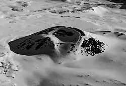 The Snowshoe Lava Field consists of more than 40 km2 (15 sq mi) of blocky lava flows that issued from 12 eruptive centres.[10] Most of these eruptive centres are more than 1,800 m (5,900 ft) in elevation and are located on the southern and western flanks of Ice Peak, the prominent south peak of Mount Edziza.[2][4][11] Cocoa Crater, Coffee Crater, Keda Cone, Tennena Cone and The Saucer are the only named eruptive centres in the Snowshoe Lava Field.[2][12] Tennena Cone on the upper western side of Ice Peak is the highest with an elevation of 2,390 m (7,840 ft), although the Global Volcanism Program gives a lower elevation of 2,350 m (7,710 ft) for the cone.[1][5][13] Cocoa Crater and Coffee Crater on the western and southern flanks of Ice Peak attain elevations of 2,117 and 2,000 m (6,946 and 6,562 ft), respectively, and are so-named for their deep colours.[1][9] Keda Cone, 1,980 m (6,500 ft) in elevation, is just south of Coffee Crater on the southern side of upper Taweh Creek.[1] The Saucer is a low, circular mound of lava 1,920 m (6,300 ft) in elevation on the southern flank of Ice Peak bounded by concentric ridges of broken lava slabs.[2][1][3]