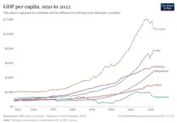 Pakistan has been beset with terrorism, economic issues, and military dominance of its government since Independence,[175] with none of its Prime Ministers having completed a full 5-year term in office.[176] India has grown significantly,[177] having slashed its rate of extreme poverty to below 20%[178] and surpassed Pakistan's GDP per capita in the 2010s due to economic liberalisation from the 1980s onward.[179] Bangladesh, having struggled greatly for decades due to conflict with and economic exploitation by Pakistan,[180][181] is now one of the fastest-growing countries in the region, beating India in terms of GDP per capita.[182][183] Afghanistan has gone through several invasions and Islamist regimes, with many of its refugees having gone to Pakistan and other parts of South Asia and bringing back cultural influences such as cricket.[184][185] Religious nationalism has grown across the region,[186][187] with persecution causing millions of Hindus and Christians to flee Pakistan and Bangladesh,[188][189] and Hindu nationalism having grown in India with the election of the Bharatiya Janata Party in 2014.[187]