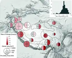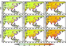 South Asian countries are expected to experience more flooding in the future as the monsoon pattern intensifies.[205]: 1459 Across Asia as a whole, 100-year extremes in vapour transport (directly related to extreme precipitation) would become 2.6 times more frequent under 1.5 °C (2.7 °F) of global warming, yet 3.9 and 7.5 times more frequent under 2 °C (3.6 °F) and 3 °C (5.4 °F). In parts of South Asia, they could become up to 15 times more frequent.[204] At the same time, up to two-thirds of glacier ice in the Hindu Kush region may melt by 2100 under high warming, and these glaciers feed the water basin of over 220 million people.[205]: 1487 As glacier meltwater flow diminishes after 2050, Hydropower generation would become less predictable and reliable, while agriculture would become more reliant on the intensified monsoon than ever before.[206][207][208] Around 2050, people living in the Ganges and Indus river basins (where up to 60% of non-monsoon irrigation comes from the glaciers[209]) may be faced with severe water scarcity due to both climate and socioeconomic reasons.[205]: 1486