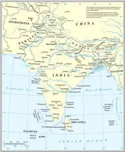 The geographical extent is not clear cut as systemic and foreign policy orientations of its constituents are quite asymmetrical.[39] Beyond the core territories of the Indian Empire (territories of the British Empire which were under the system of British Raj), there is a high degree of variation as to which other countries are included in South Asia.[40][41][42][43] There is no clear boundary – geographical, geopolitical, socio-cultural, economical, or historical – between South Asia and other parts of Asia, especially Southeast Asia and West Asia.[44] Most of this region is peninsular, resting on the Indian Plate and being isolated from the rest of Asia by mountain barriers;[45][46] it resembles a diamond which is delineated by the Himalayas on the north, the Hindu Kush in the west, and the Arakanese in the east,[47] and which extends southward into the Indian Ocean with the Arabian Sea to the southwest and the Bay of Bengal to the southeast.[48][49]