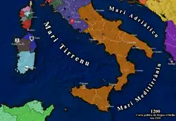 The term "Mezzogiorno" today mostly refers to the regions that are associated with the people, lands or culture of the historical and cultural region that was once politically under the administration of the former Kingdoms of Naples and Sicily (officially denominated as one entity Regnum Siciliae citra Pharum and ultra Pharum, i.e. "Kingdom of Sicily on the other side of the Strait" and "across the Strait") and which later shared a common organization into Italy's largest pre-unitarian state, the Kingdom of the Two Sicilies.[5][6][7][8][9][10]
