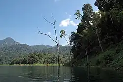 Southern Thailand is on the Malay Peninsula, with an area of around 70,714 km2 (27,303 sq mi), bounded to the north by Kra Isthmus, the narrowest part of the peninsula. The western part has highly steep coasts, while on the east side river plains dominate. The largest river in the south is the Tapi, in Surat Thani, which, together with the Phum Duang in Surat Thani, drains more than 8,000 km2 (3,100 sq mi), more than 10 percent of the total area of southern Thailand. Smaller rivers include the Pattani, Saiburi, Krabi, and the Trang. The largest lake in the south is Songkhla Lake (1,040 km2 (400 sq mi) altogether). The largest artificial lake is the Chiao Lan (Ratchaprapha Dam), occupying 165 km2 (64 sq mi) of Khao Sok National Park in Surat Thani. The total forest area is 17,964 km2 (6,936 sq mi) or 24.3 percent of provincial area.[1]